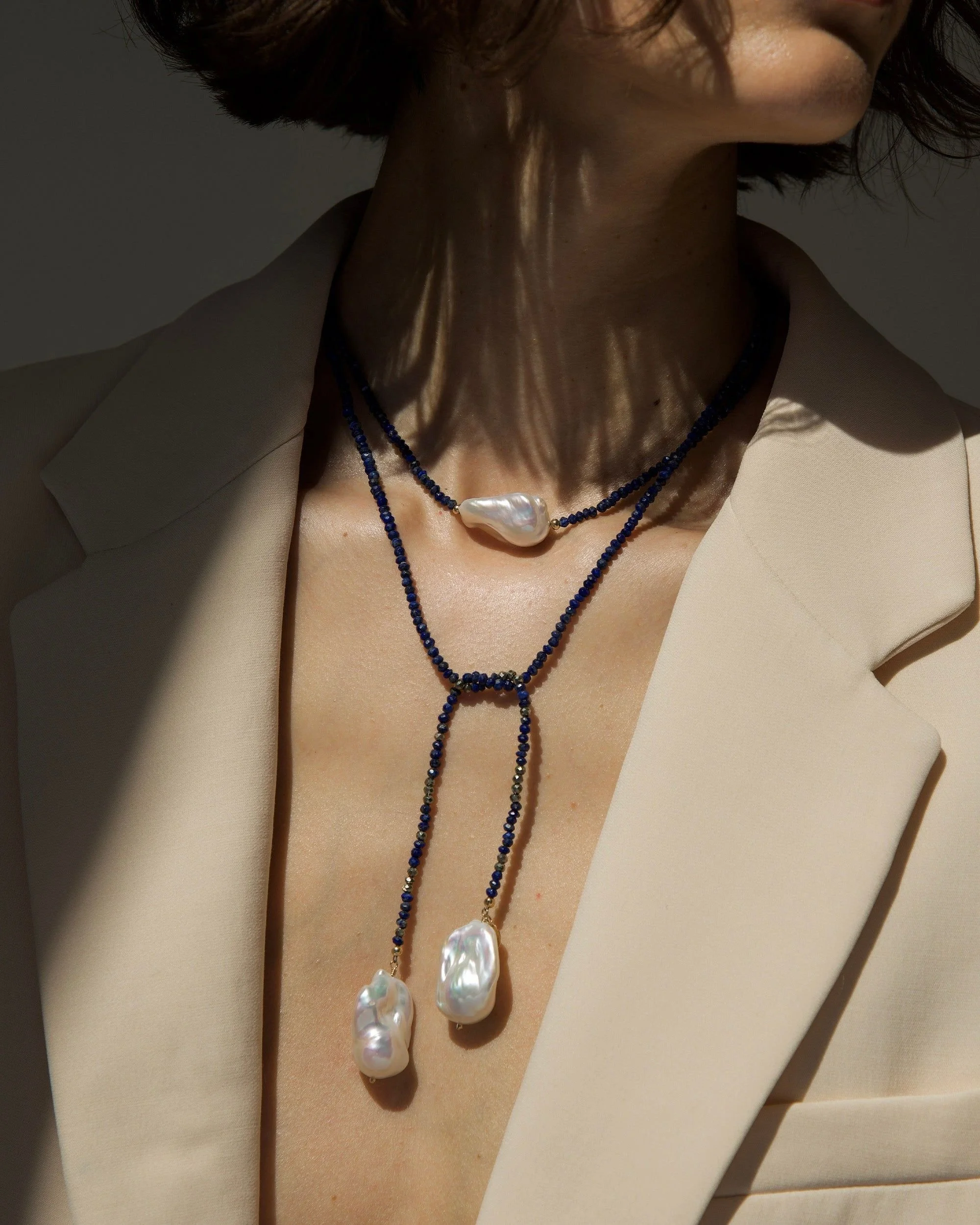 The quiet glow of baroque pearls tethered to deep navy beads. Like dusk on water—mysterious, serene.