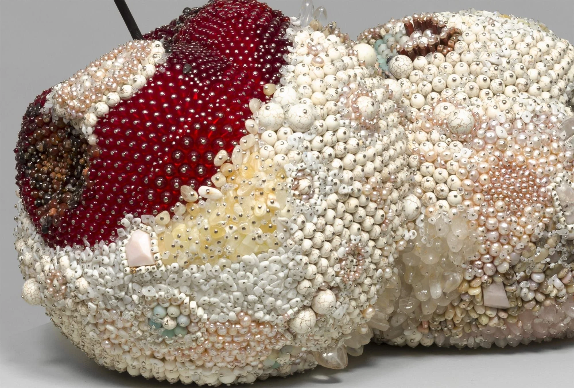 An overripe wonder. Made of pearls, gems, and glass beads, this glimmering sculpture is part fruit, part fantasy.