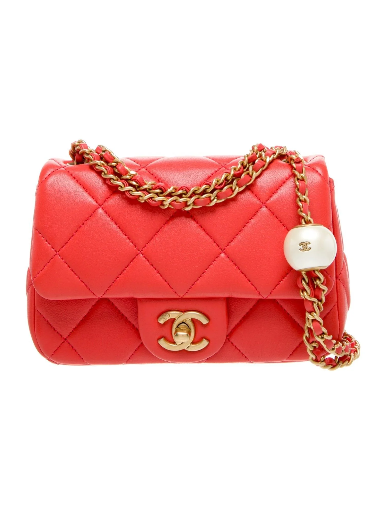 A classic gets a twist: this bold red Chanel is topped with a single pearl charm, like a wink from Coco herself.