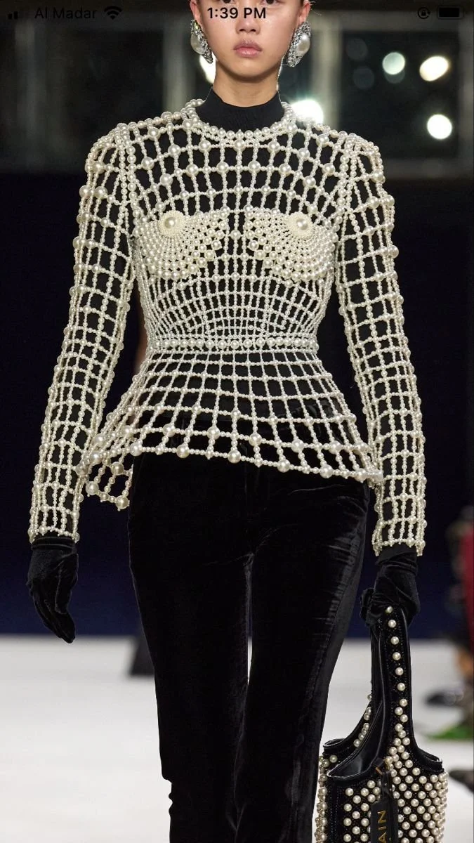 Architectural and unapologetic, this pearl corset blouse turns the body into a jewel box.