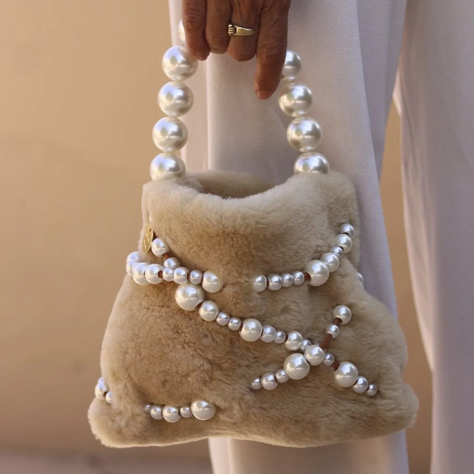 Teddy bear texture meets prom-night glam. A bag for dreamers, with pearls scattered like candy.