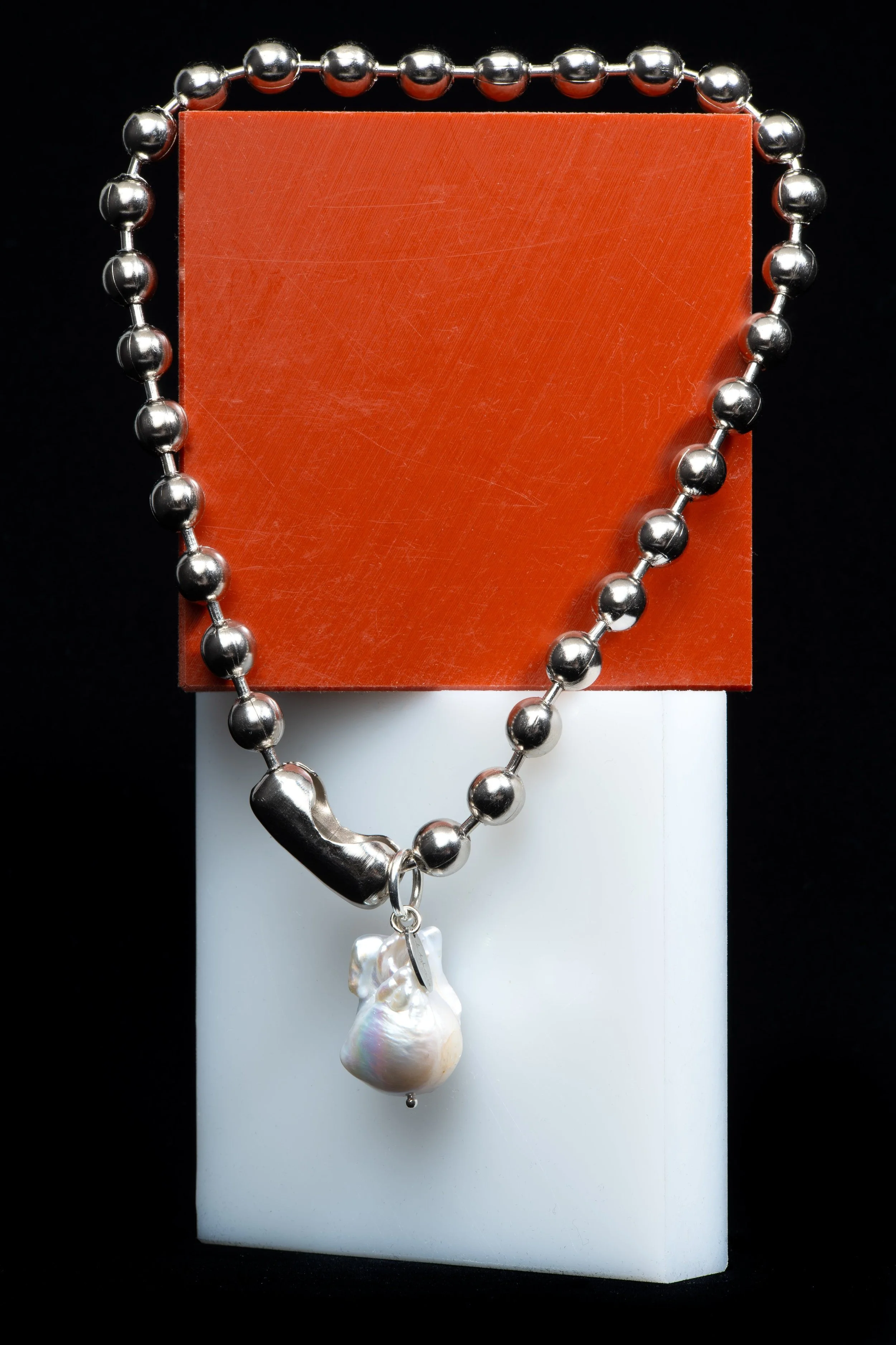 A little lunar, a little punk. A baroque pearl drop softens the tough glint of silver.